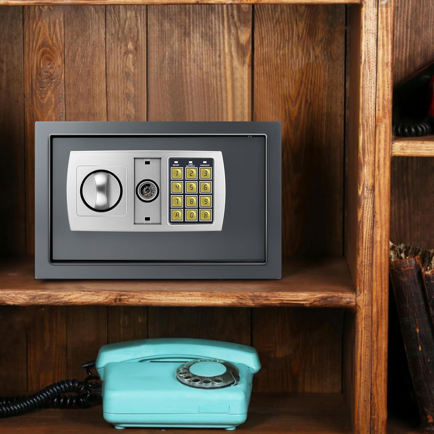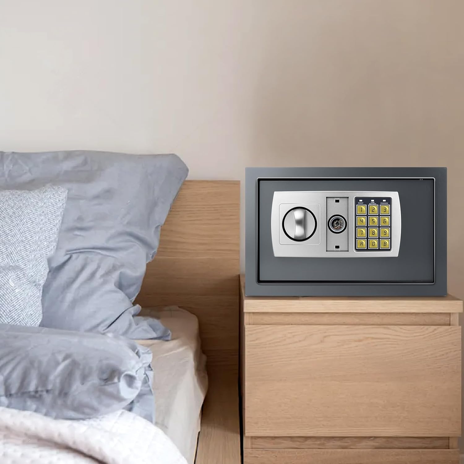 Caja de seguridad digital 4,2 litros Caja de Seguridad 4.22 litros Steelock es un compartimento cuya cerradura sólo se puede accionar mediante una clave numérica, para evitar que sea abierta por personas no autorizadas. Se usa para guardar documentos, joyas y otros objetos de valor. Se puede instalar empotrada en un muro o el piso. Características Fabricada en metal, puerta de apertura frontal, con teclado digital. Incluye 4 baterías de 1,5 V, llaves de seguridad para abrir en caso de agotarse las baterías y pernos de anclaje. Es un producto Steelock, marca exclusiva de Sodimac. La Caja de Seguridad 4.22 litros Steelock dispone de 99 millones de combinaciones posibles para la clave de apertura. Por sus amplias dimensiones, constituye una conveniente alternativa para disponer de un espacio seguro para guardar valores en el hogar u oficina. Código: abre y cierra con código de 3 a 8 dígitos. Indicador: 3 luces indicadoras (verde, rojo y amarillo), indican abierto, batería baja y advertencia. Sistema de trabajo: use la perilla para abrir y cerrar con un sistema único. Botón de reinicio: Cambie el código fácilmente con el botón de reinicio. Perno: Unica forma de bloqueo de perno (2 pernos de 20mm)Anulación de llave: Proporcione la llave de anulación para uso de emergencia. Interior: incluye alfombra protectora de piso. Batería: funciona con 4 baterías 1.5V AA (no incluye)Fijación: Agujeros pre perforados en la parte inferior y trasera. Medidas: Alt: 0.17/ Larg: 0.23/ Prof: 0.17Material: metal Peso: 3Kg